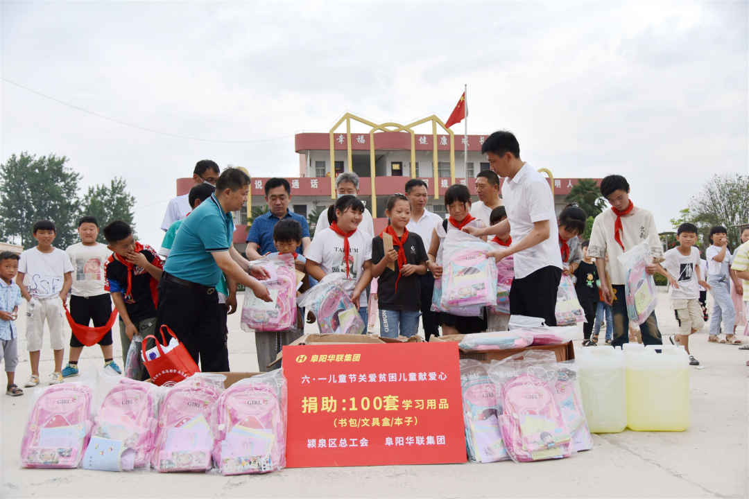 阜陽(yáng)華聯(lián)集團為孩子們送來(lái)了書(shū)包、文具盒、本子等學(xué)習用品100套,