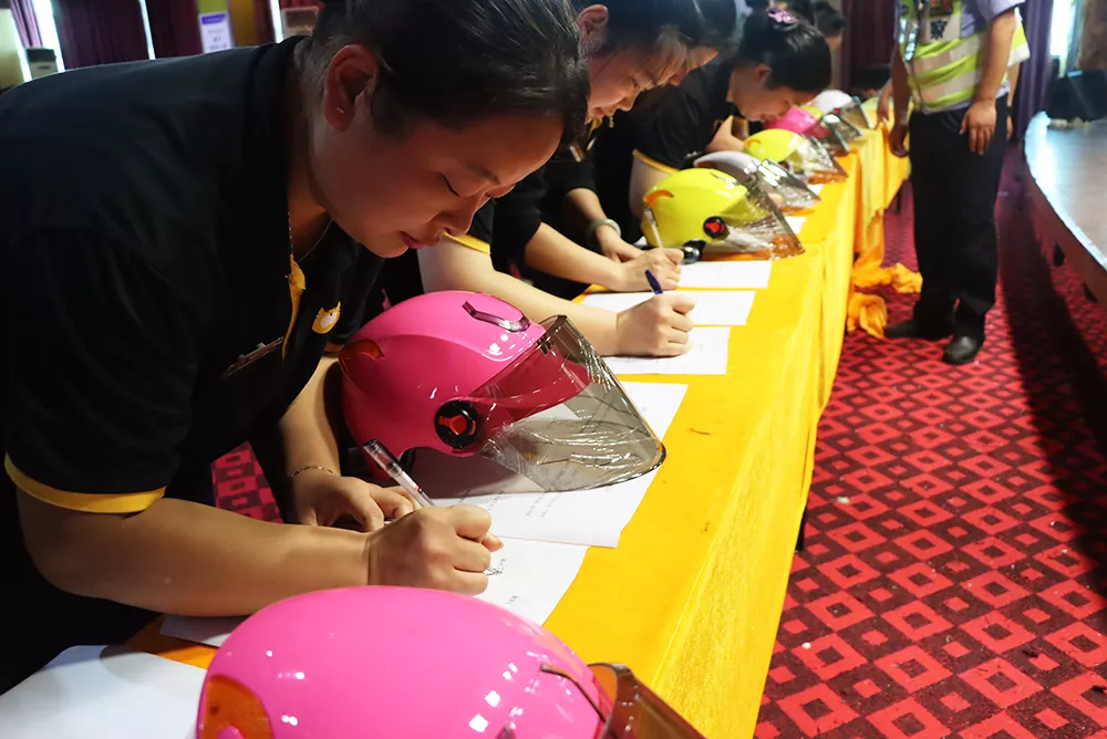 會(huì )上,交警同志將二十余頂愛(ài)心頭盔免費發(fā)放給華聯(lián)員工,并現場(chǎng)示范如何正確佩戴。員工自覺(jué)簽下安全承諾書(shū),紛紛表示這樣的活動(dòng)很有意義,自己也會(huì )用實(shí)際行動(dòng)提醒身邊的親戚朋友和同事要自覺(jué)佩戴安全頭盔、系好安全帶,確保自身安全。