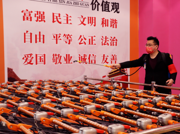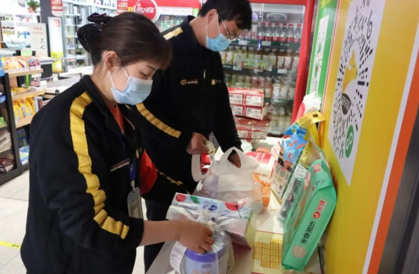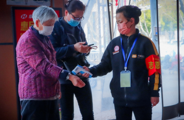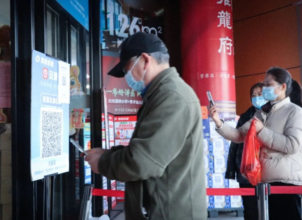 在超市的入口處,工作人員對進(jìn)入的所有員工、消費者進(jìn)行測溫、驗碼,提醒來(lái)往顧客佩戴好口罩,并備好酒精、口罩等防疫物品。