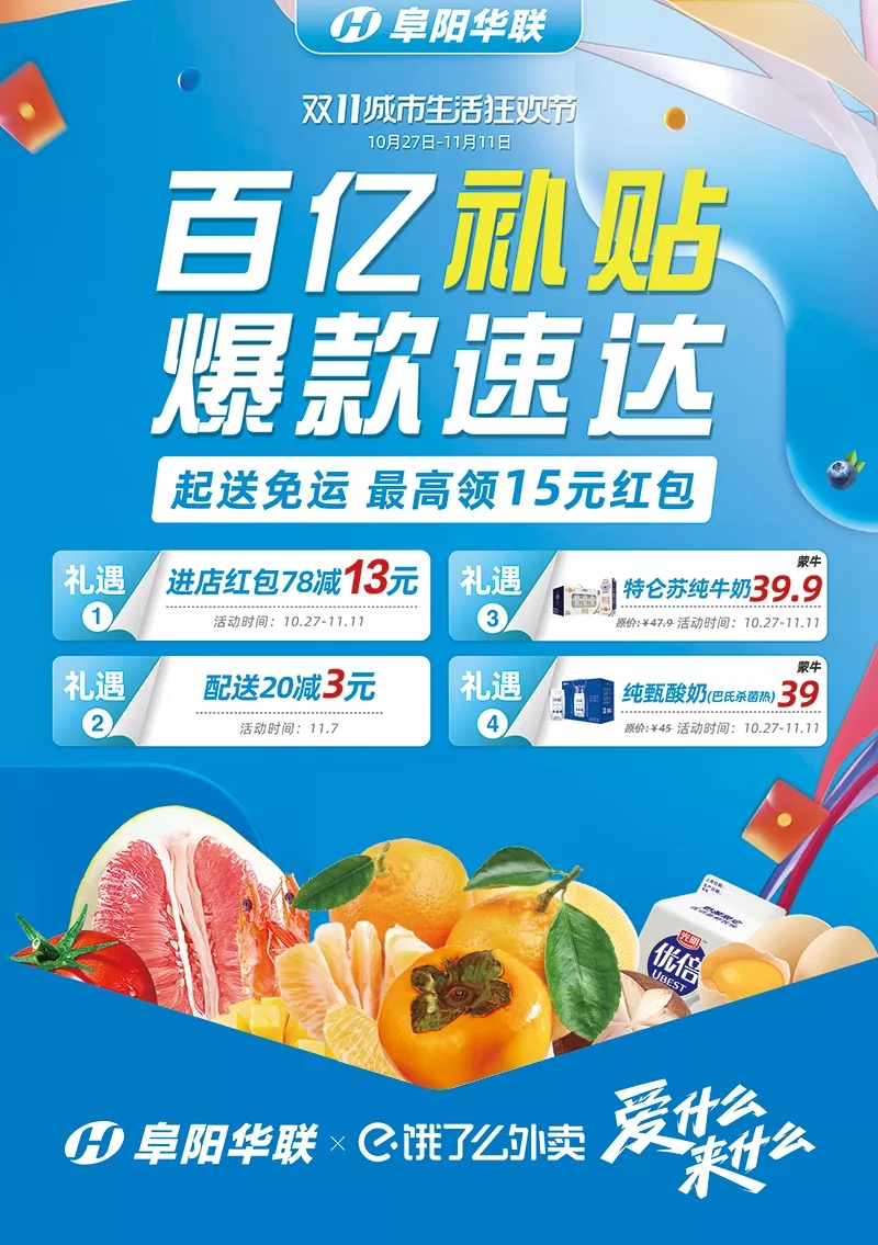 阜陽(yáng)華聯(lián) | 餓了么百億補貼,雙十一提前購,千款直降好物,1小時(shí)送達到家!